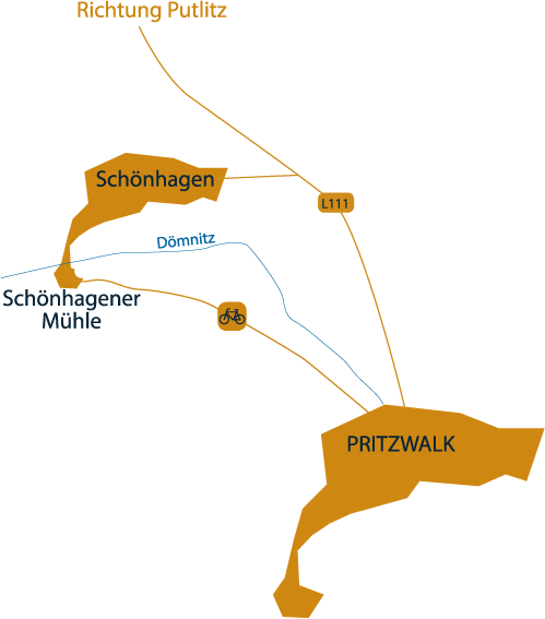 Folgen Sie der A 24 und nehmen Sie die Abfahrt Meyenburg in Richtung Pritzwalk. Bleiben Sie auf der Umgehungsstraße bis zur Landstrasse nach Putlitz, dort biegen Sie rechts ab und nach weiteren zwei Kilometern links in das Dorf Schönhagen. Wenn Sie dieses fast ganz durchquert haben, nehmen Sie links die Abbiegung zum Mühlenweg, der Sie an die Dömnitz zur Schönhagener Mühle führt.